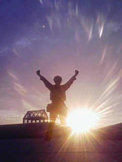 この写真は夕日に向かって心の叫びを上げるソーマン氏